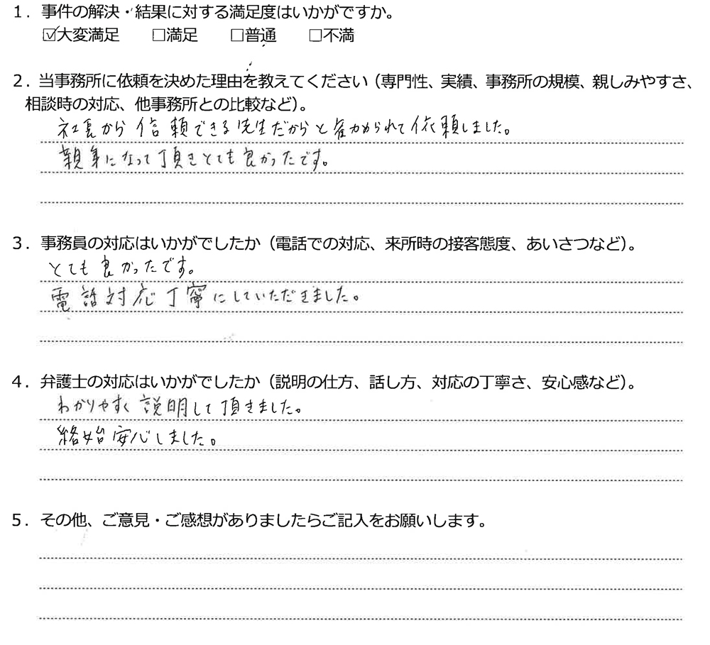 社長から信頼できる先生だからと紹介されて依頼しました。親身になって頂きとても良かったです。